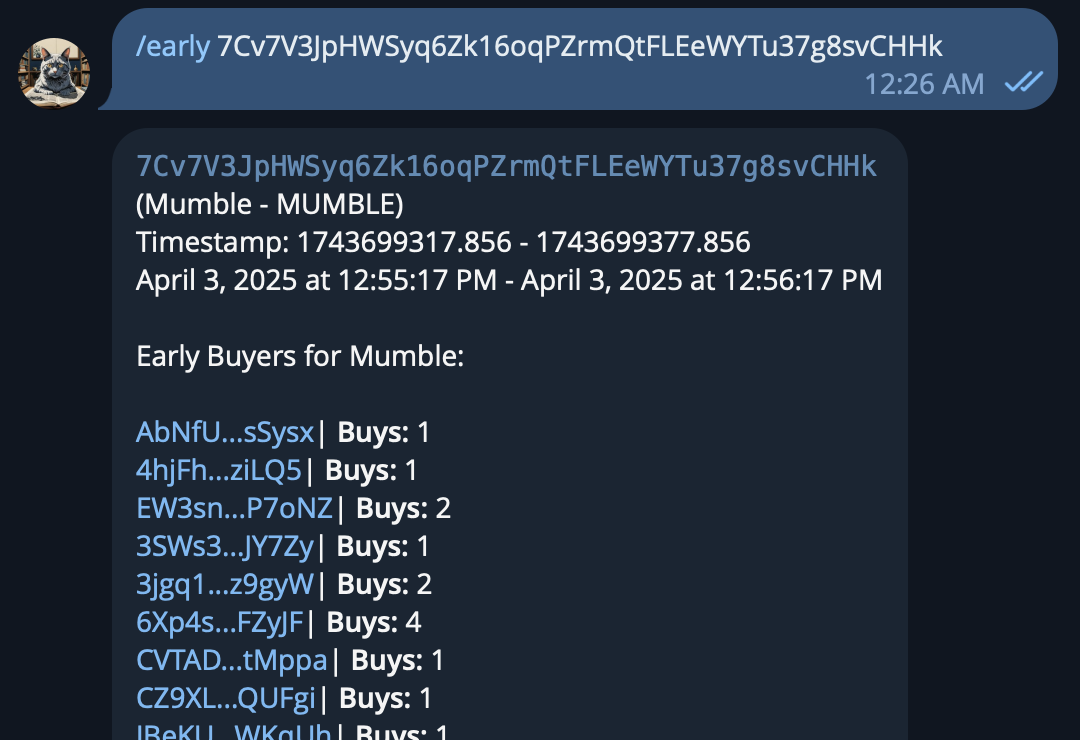 * -2m or -2min will get you the early wallets within 2 minutes of token creation