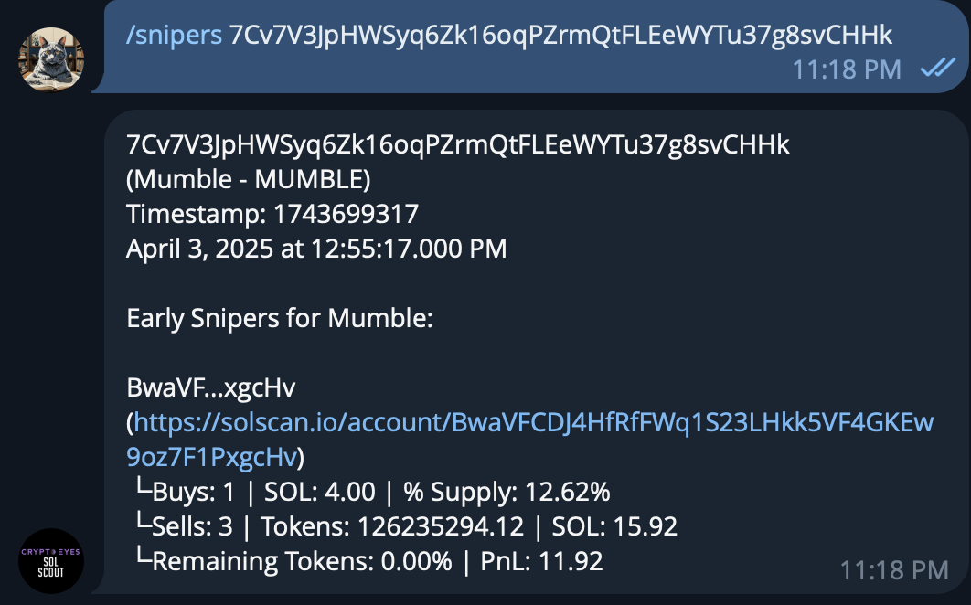 <figure><img src="https://2366715571-files.gitbook.io/~/files/v0/b/gitbook-x-prod.appspot.com/o/spaces%2FwZhT2rt1MEsR0j03JVUI%2Fuploads%2FjlSNETvIaDVO9Gb0Rjyf%2Fimage.png?alt=media&#x26;token=d775140c-5ad2-4585-8f0c-73591c2181f4" alt=""><figcaption><p>/snipers command example</p></figcaption></figure>