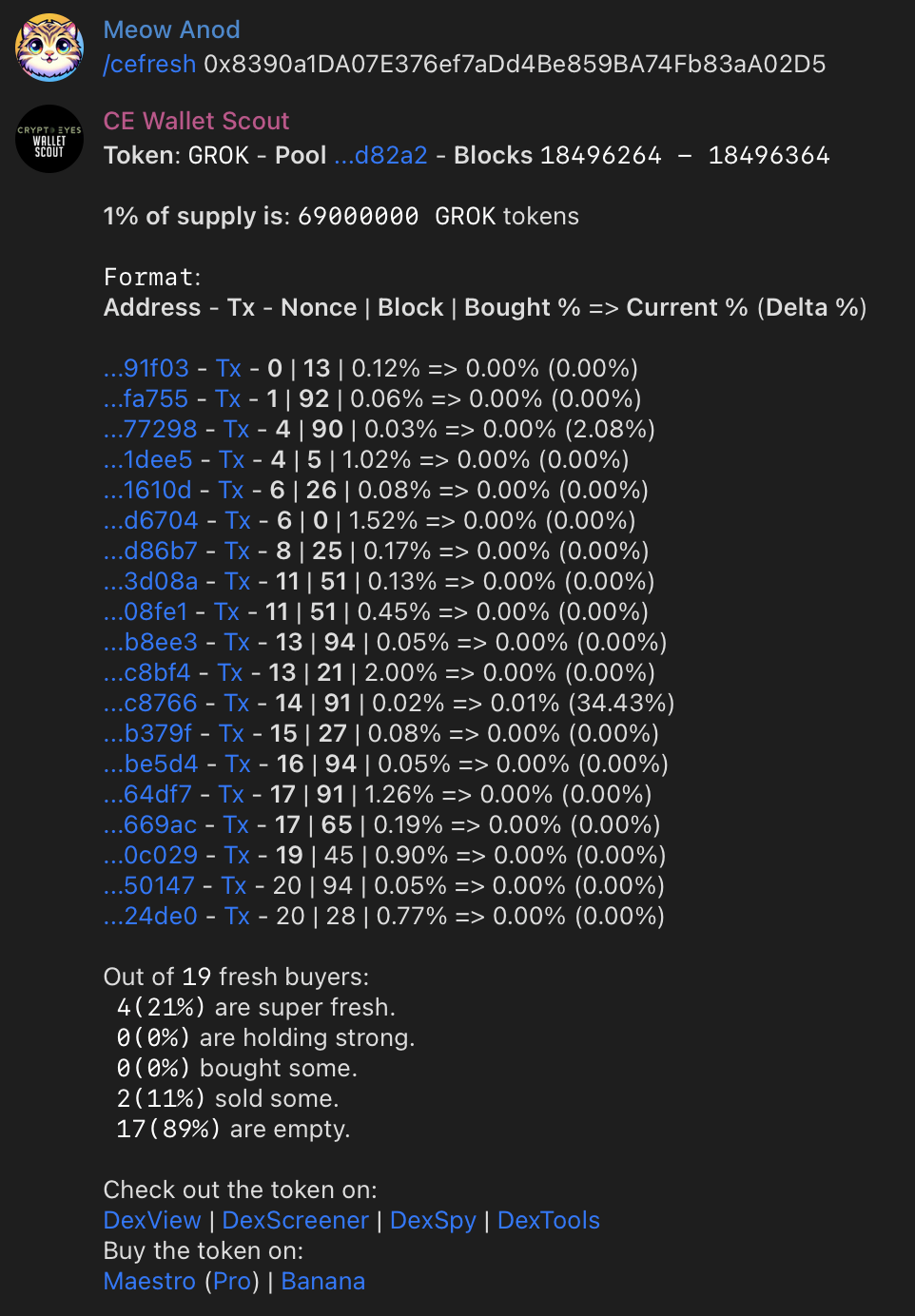 Powered by our Fresh Wallets Detective, this feature helps you spot the wallets that got into a token in its infancy. Know their point of entry, their current holdings, and even whether they're crypto newbies or seasoned veterans.