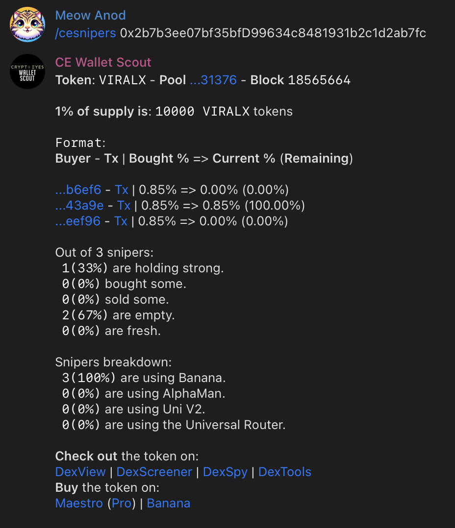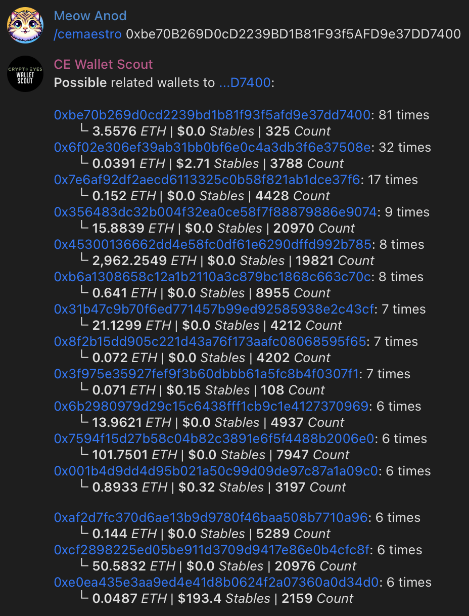 Gone are the days of hidden secondary wallets. This unique command peels back the layers, unveiling wallets linked to a primary 'maestro' account. A treasure trove for those who relish the hunt for concealed assets.